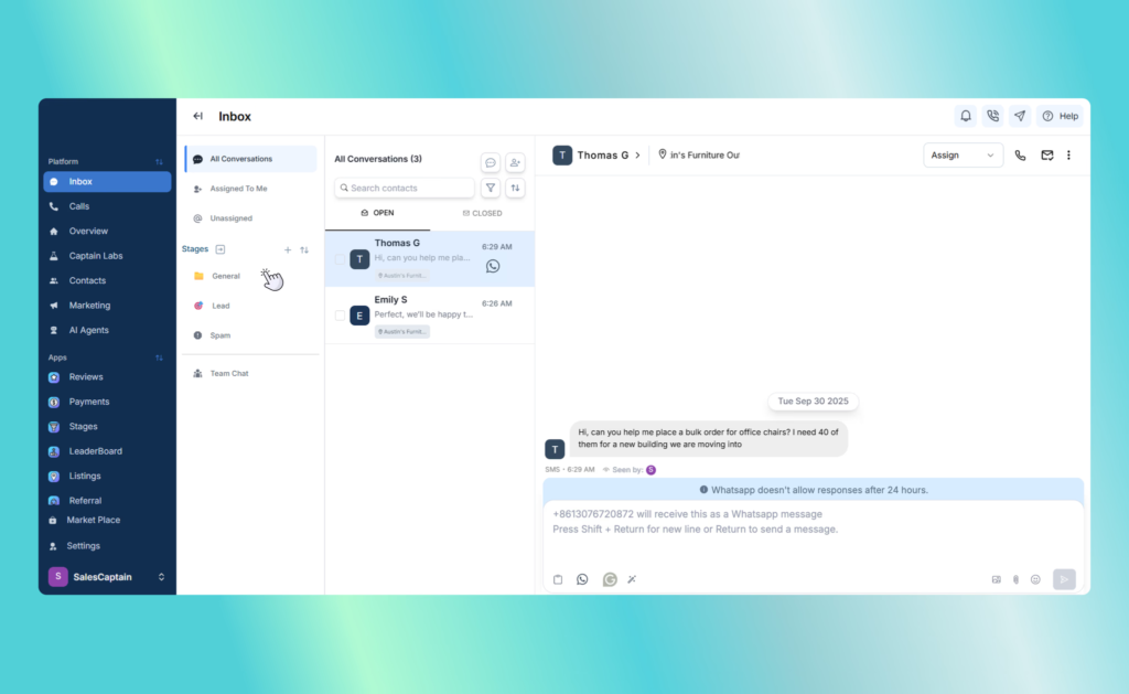 Managing multiple platforms can be a hassle, but SalesCaptain centralizes all communications in a single inbox, ensuring no message goes unattended. Teams can prioritize leads and inquiries, delivering faster, high-quality service without juggling multiple tools.